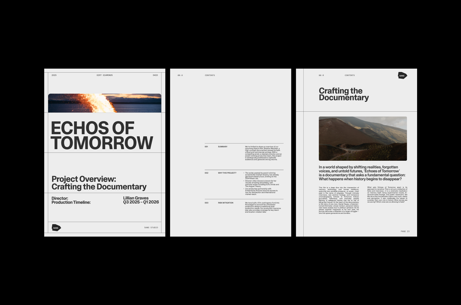 Create a visual system for production company, SANS Studio. This design treats SANS films as modern artefacts; built to last beyond trends, ensuring that each piece of work carries weight, depth, and enduring significance.